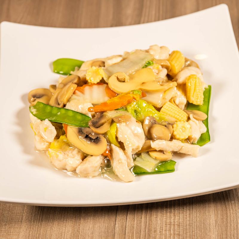Snow peas, baby com, mushrooms, carrots & Chinese cabbage sauteed in a delicate wine sauce.